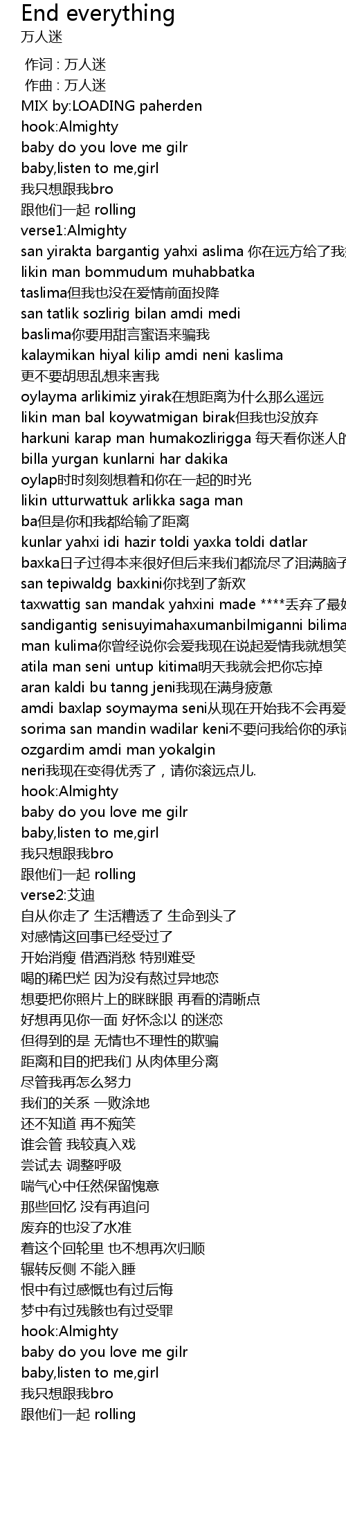 | [00:38.151] | kalaymikan hiyal kilip amdi neni kaslima geng bu yao hu si luan xiang lai hai wo |