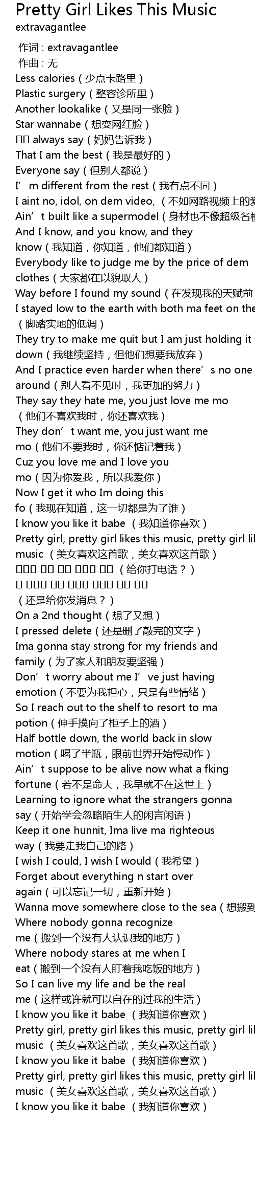 | [02:52.936] | Pretty girl, pretty girl likes this music, pretty girl likes this music (美女喜欢这首歌,美女喜欢这首歌) |