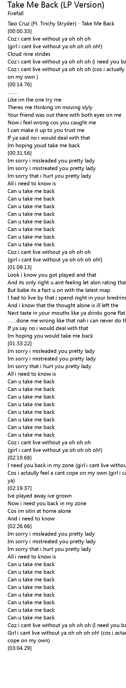 [00:00.14] Taio Cruz (Ft. Tinchy Stryder) - Take Me Back