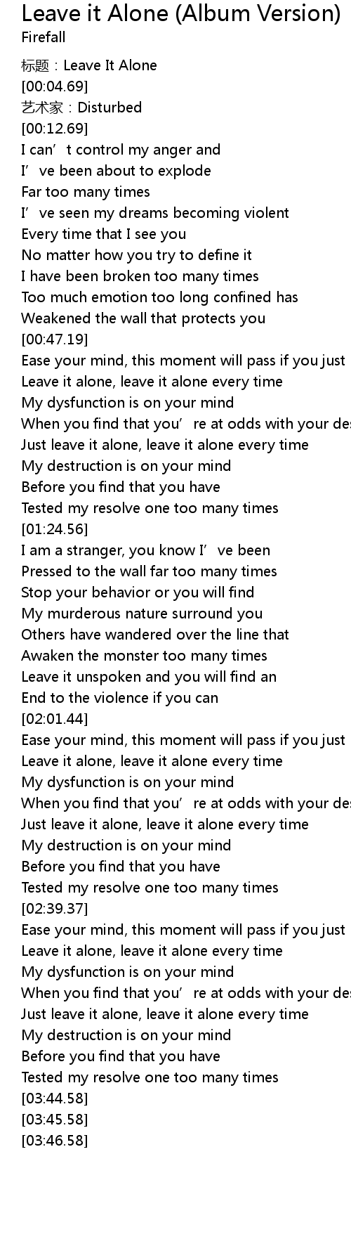 | [00:53.13] | Leave it alone, leave it alone every time |