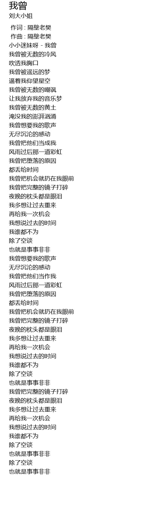 | [00:00.000] | 作词 : 隔壁老樊 |