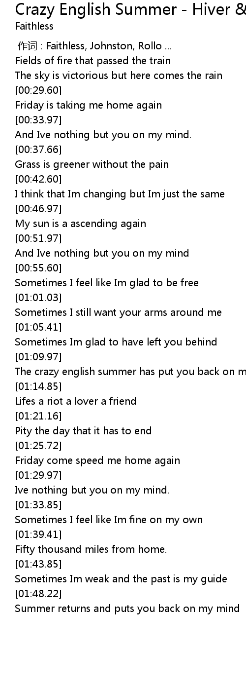 | [01:11.04] | The crazy english summer has put you back on my mind. |