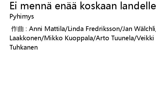 | [00:00.000] | 作曲 : Anni Mattila/Linda Fredriksson/Jan Wälchli/Jooel Laakkonen/Mikko Kuoppala/Arto Tuunela/Veikki Virkajärvi/Eero Tikkanen/Heikki Tuhkanen |