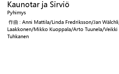 | [00:00.000] | 作曲 : Anni Mattila/Linda Fredriksson/Jan Wälchli/Jooel Laakkonen/Mikko Kuoppala/Arto Tuunela/Veikki Virkajärvi/Eero Tikkanen/Heikki Tuhkanen |