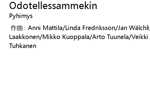 | [00:00.000] | 作曲 : Anni Mattila/Linda Fredriksson/Jan Wälchli/Jooel Laakkonen/Mikko Kuoppala/Arto Tuunela/Veikki Virkajärvi/Eero Tikkanen/Heikki Tuhkanen |