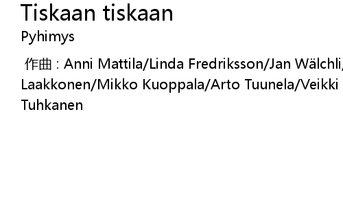 | [00:00.000] | 作曲 : Anni Mattila/Linda Fredriksson/Jan Wälchli/Jooel Laakkonen/Mikko Kuoppala/Arto Tuunela/Veikki Virkajärvi/Eero Tikkanen/Heikki Tuhkanen |