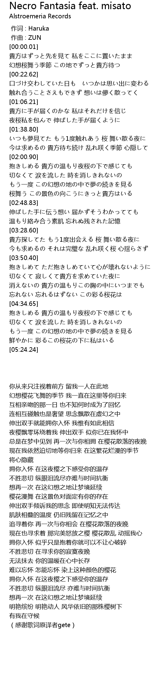 | [00:10.71] | 幻想桜舞う季節 この地でずっと貴方待つ |