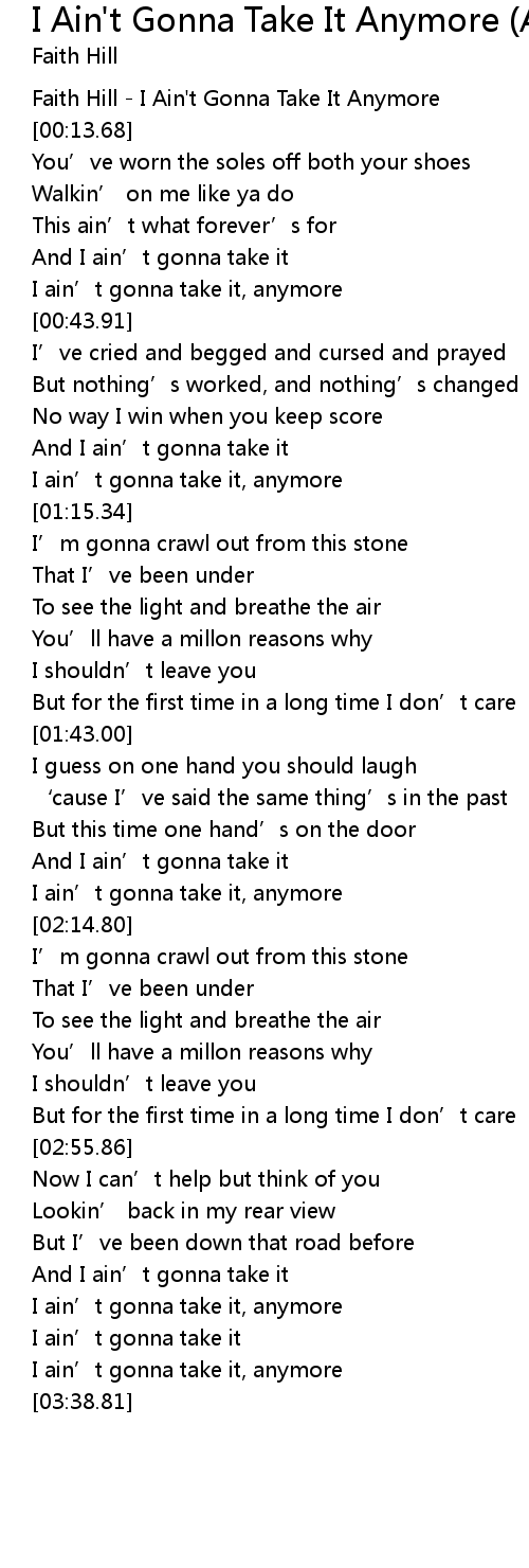 | [00:00.00] | Faith Hill - I Ain't Gonna Take It Anymore |
