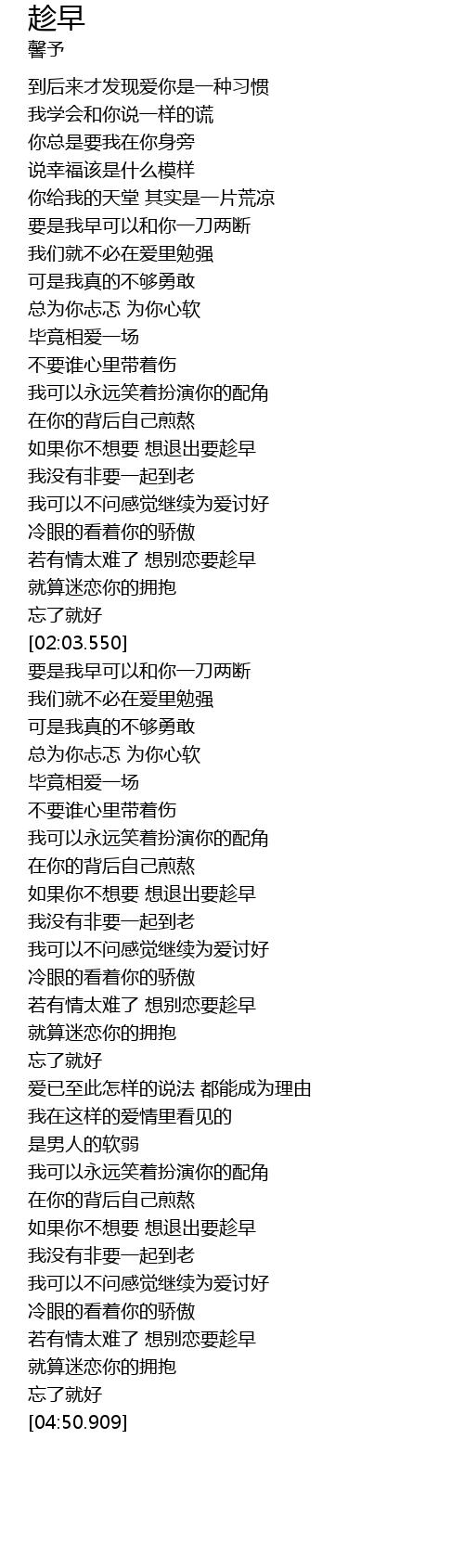 | [01:50.660] | ruò yǒu qíng tài nán le xiǎng bié liàn yào chèn zǎo |