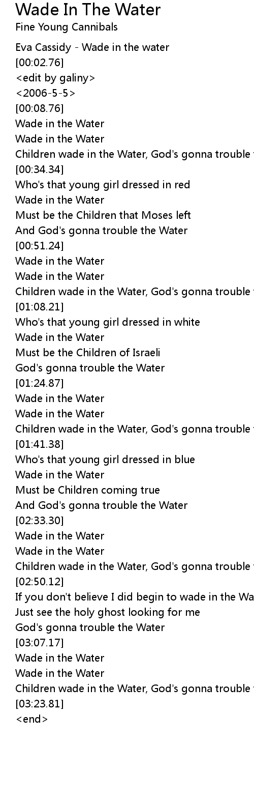 [02:41.13] Children wade in the Water, God's gonna trouble the Water