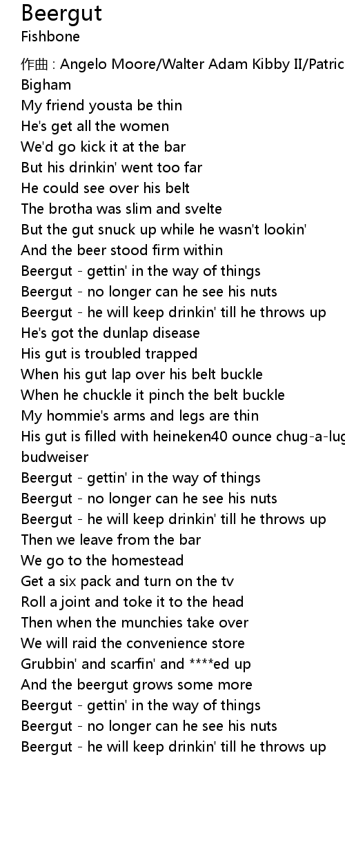 | His gut is filled with heineken40 ounce chugalugs of old english saint ides budweiser | |