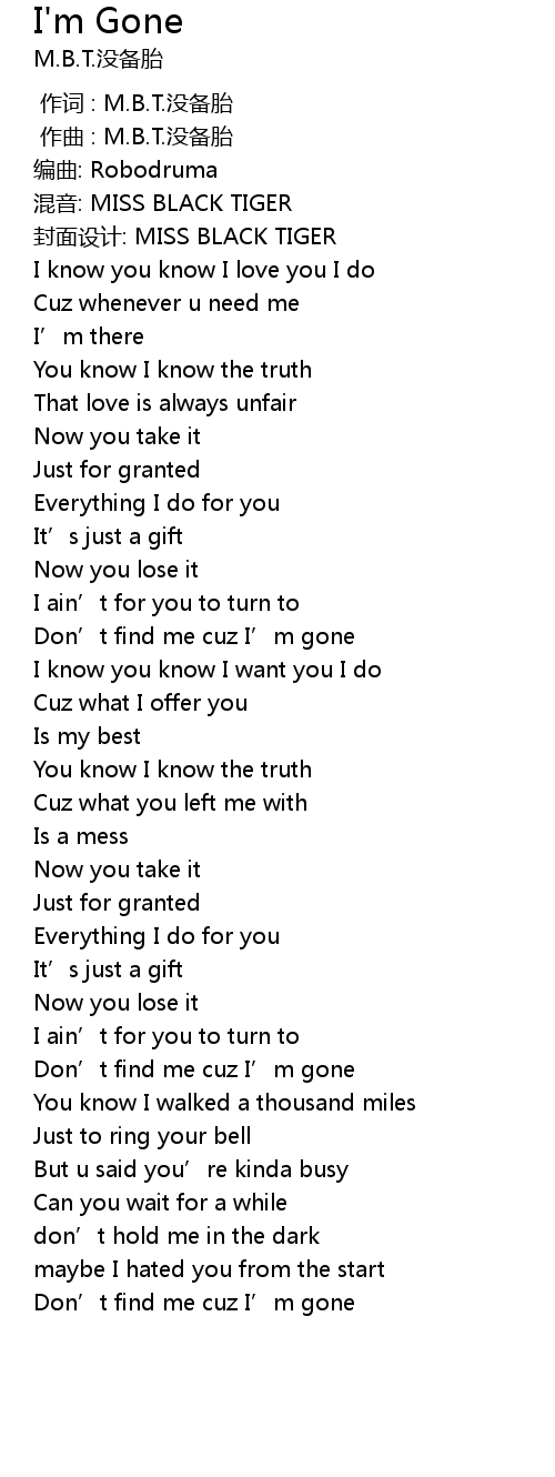 | [01:43.696] | Don' t find me cuz I' m gone |
