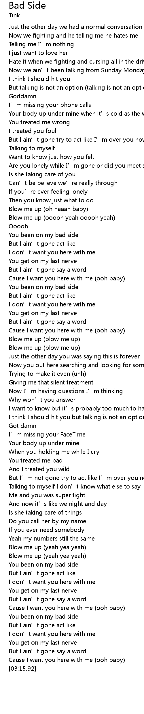 | [03:03.16] | You been on my bad side |