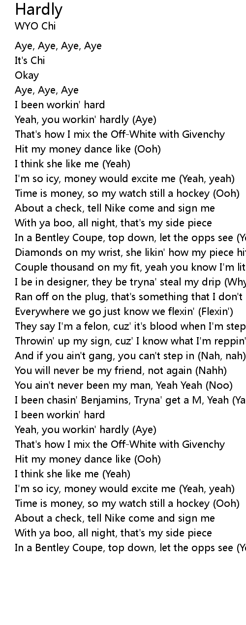| [00:11.34] | Yeah, you workin' hardly (Aye) |