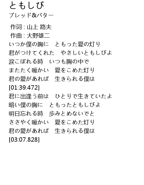 | [00:17.565] | いつか僕の胸に ともった愛の灯り |