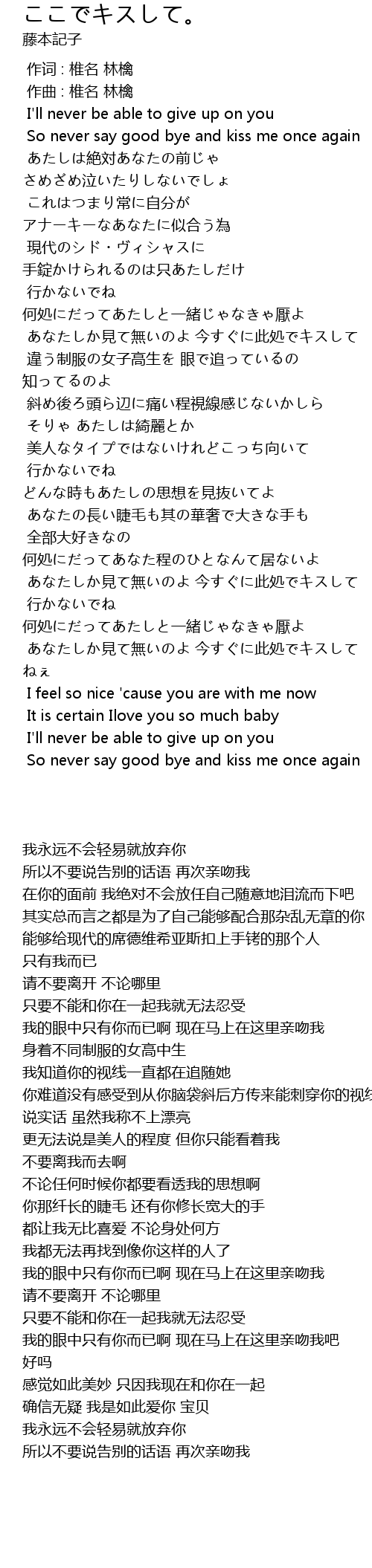 | [02:54.376] | あなたしか見て無いのよ 今すぐに此処でキスして |