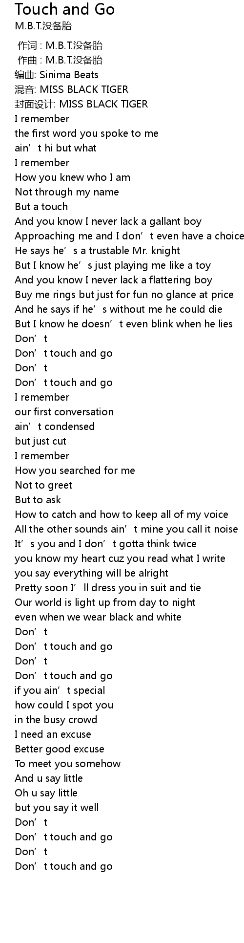 | [01:03.890] | Don' t touch and go |
