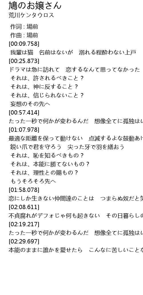 | [01:26.168] | 鋭い爪で君を守ろう 尖った牙で羽を繕おう |