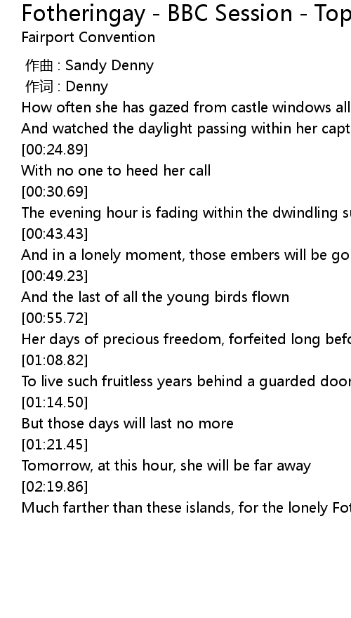 | [02:20.86] | Much farther than these islands, for the lonely Fotheringay |