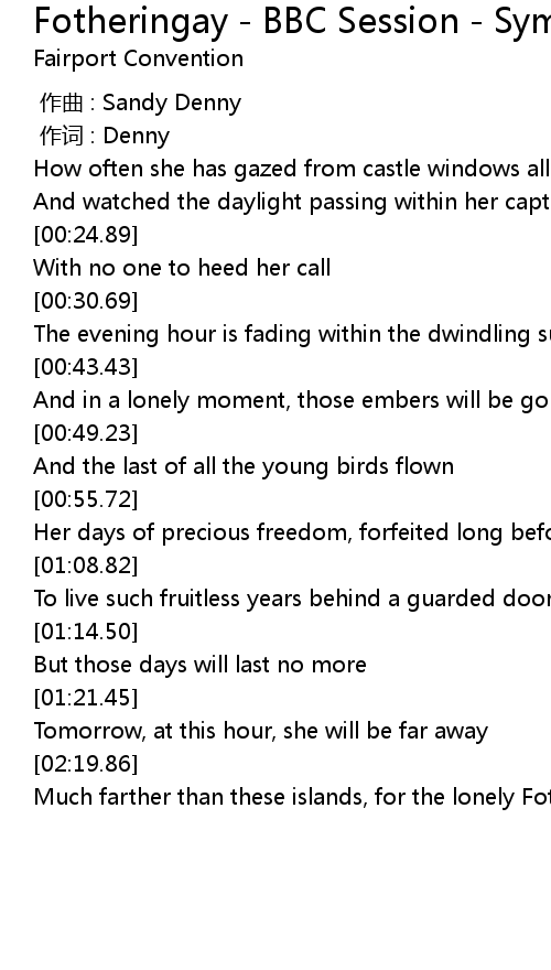 | [02:20.86] | Much farther than these islands, for the lonely Fotheringay |