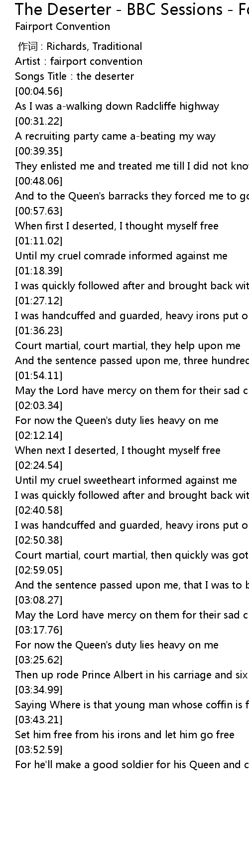 | Song | The Deserter - BBC Sessions - Folk On One 26/7/70 |