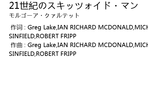 | [00:00.000] | 作曲 : Greg Lake,IAN RICHARD MCDONALD,MICHAEL REX GILES,PETER JOHN SINFIELD,ROBERT FRIPP |