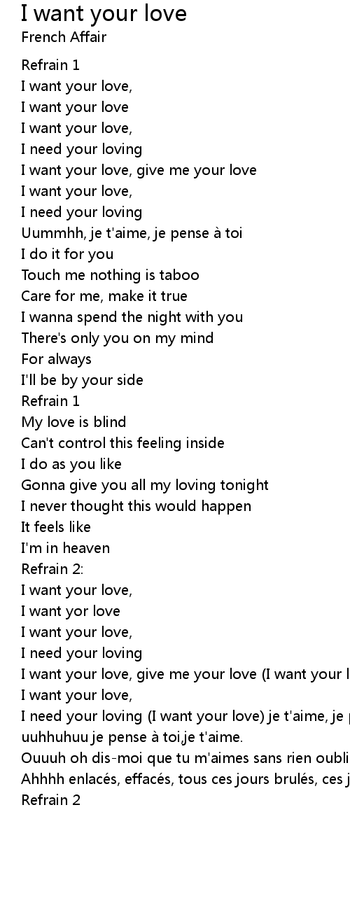 | I need your loving I want your love je t' aime, je pense a toi, je t' aime uuhhuhuu je pense a toi, je t' aime. | |