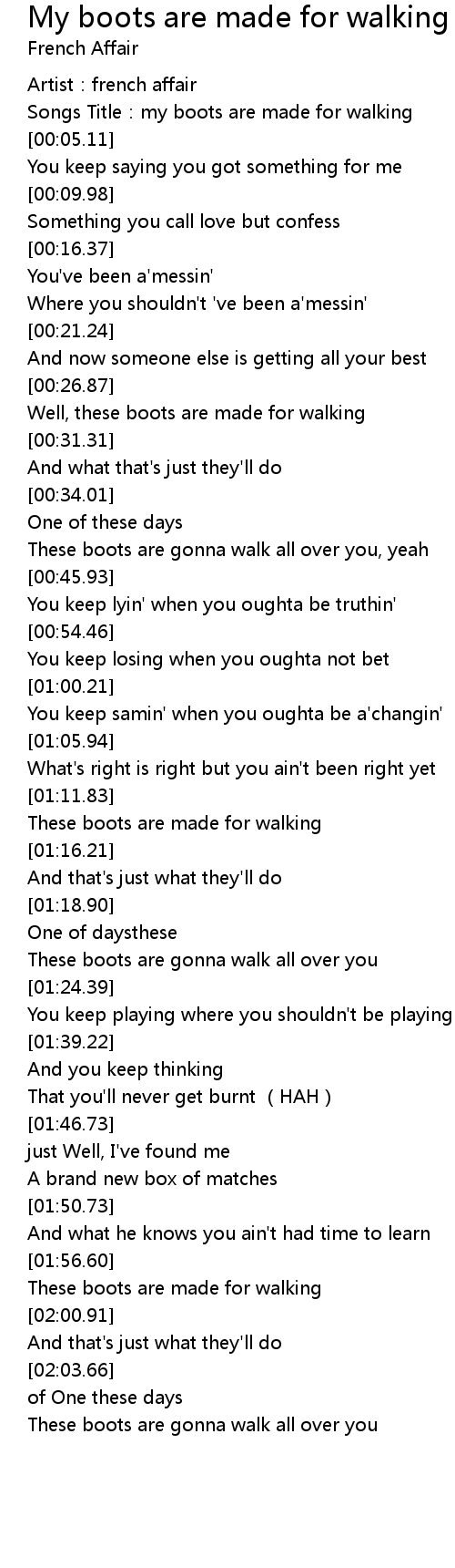 | [00:02.30] | Songs Title: my boots are made for walking |