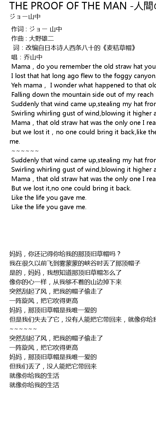 | [00:19.10] | Mama,do you remember the old straw hat you gave to me? |