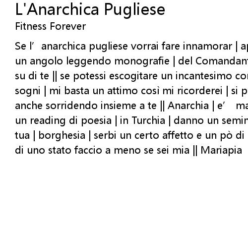 | Se l’anarchica pugliese vorrai fare innamorar | appari in biblioteca | solo in un angolo leggendo monografie | del Comandante Marcos | sentirai il suo sguardo su di te || se potessi escogitare un incantesimo con cui | entrare nei tuoi sogni | mi basta un attimo così mi ricorderei | si può cambiare il mondo | anche sorridendo insieme a te || Anarchia | e’ magia | e ogni tanto andare a un reading di poesia | in Turchia | danno un seminario di Antropologia || della tua | borghesia | serbi un certo affetto e un pò di nostalgia | ma cara mia | di uno stato faccio a meno se sei mia || Mariapia |