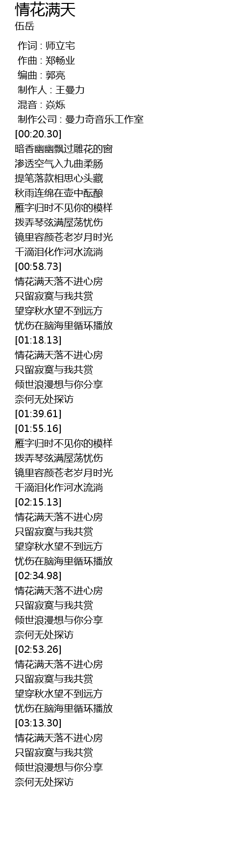 | [02:15.30] | qíng huā mǎn tiān luò bù jìn xīn fáng |