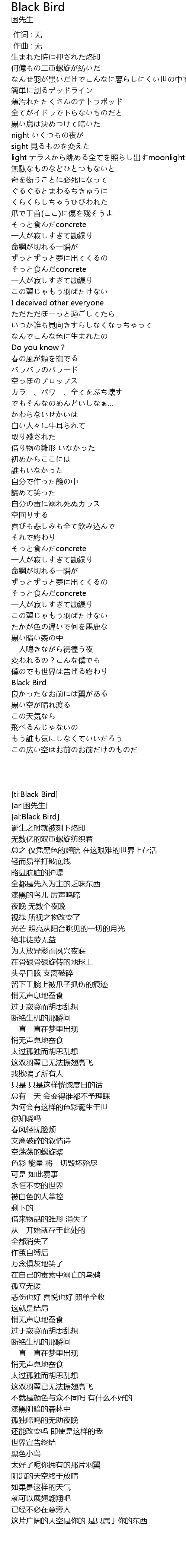 | [00:29.60] | 黒い鳥は決めつけて啼いた |