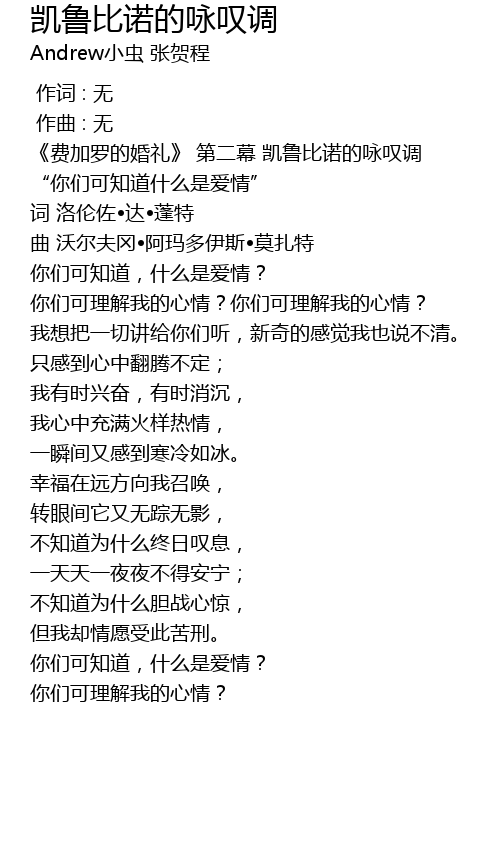 | [00:09.873] | 《费加罗的婚礼》 第二幕 凯鲁比诺的咏叹调 “你们可知道什么是爱情” |