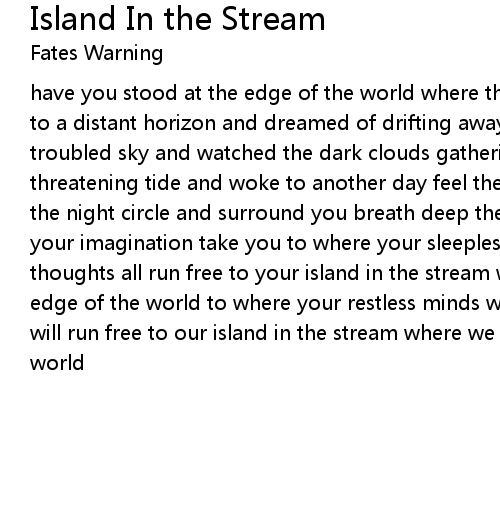 have you stood at the edge of the world where the sea and sky collide looked out to a distant horizon and dreamed of drifting away have you stood beneath a troubled sky and watched the dark clouds gathering closed your eyes to the threatening tide and woke to another day feel the cold winds all around you let the night circle and surround you breath deep the darkness that drowns you let your imagination take you to where your sleepless mind rests to where your thoughts all run free to your island in the stream where you can dream at the edge of the world to where your restless minds will sleep to where our hearts will run free to our island in the stream where we can dream at the edge of the world |