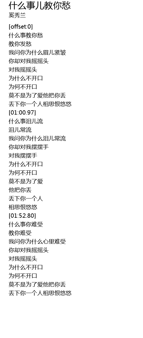 | [00:22.20] | 我问你为什么眉儿紧皱 |