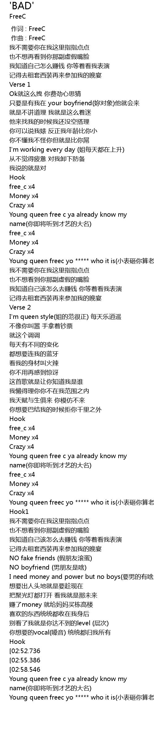 | [03:00.046] | Young queen freec yo ***** who it is(小表砸你算老几) |