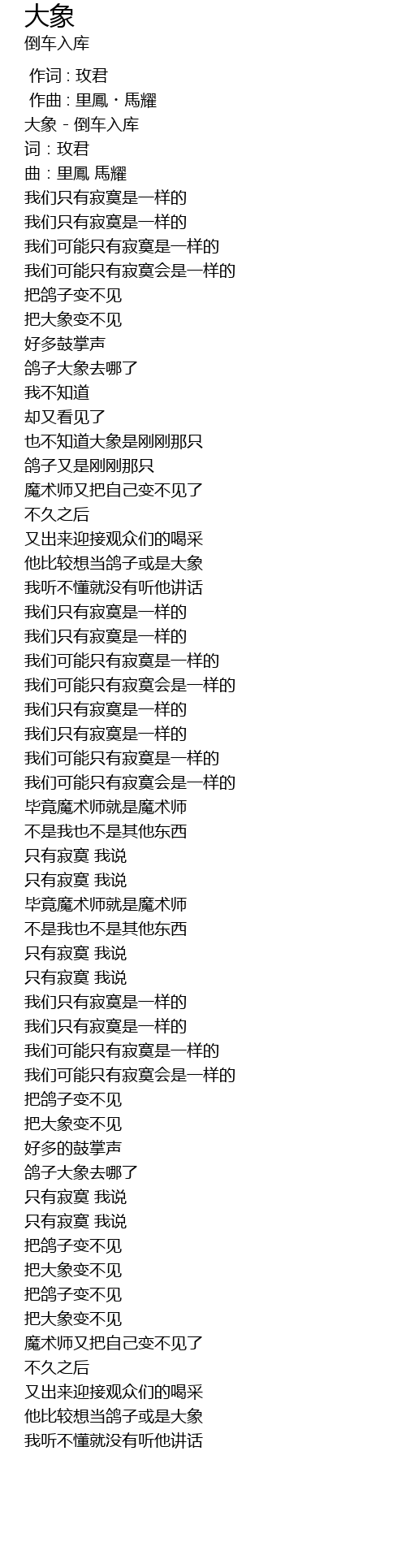 | [00:00.01] | 大象 - 倒车入库 |