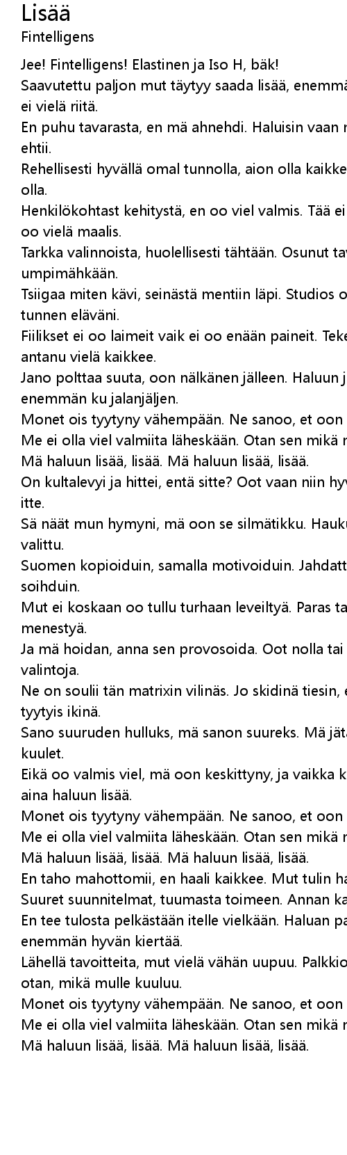 | Mä haluun lisää, lisää. Mä haluun lisää, lisää. | |