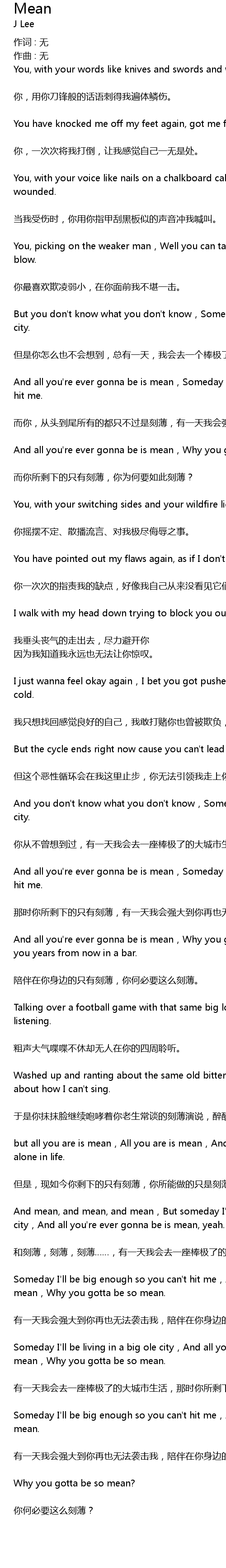 | And mean, and mean, and mean,But someday I'll be living in a big ole city,And all you're ever gonna be is mean, yeah. | |
