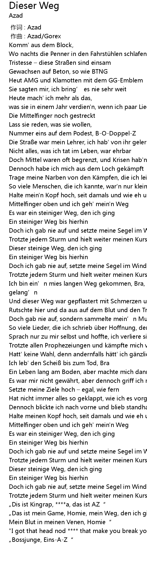 | [02:26.09] | Das ist mein Game, Homie, mein Weg, den ich ging, Homie |