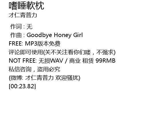 | [00:02.34] | FREE: MP3版本免费 评论即可使用(关不关注看你们喽,不强求) |