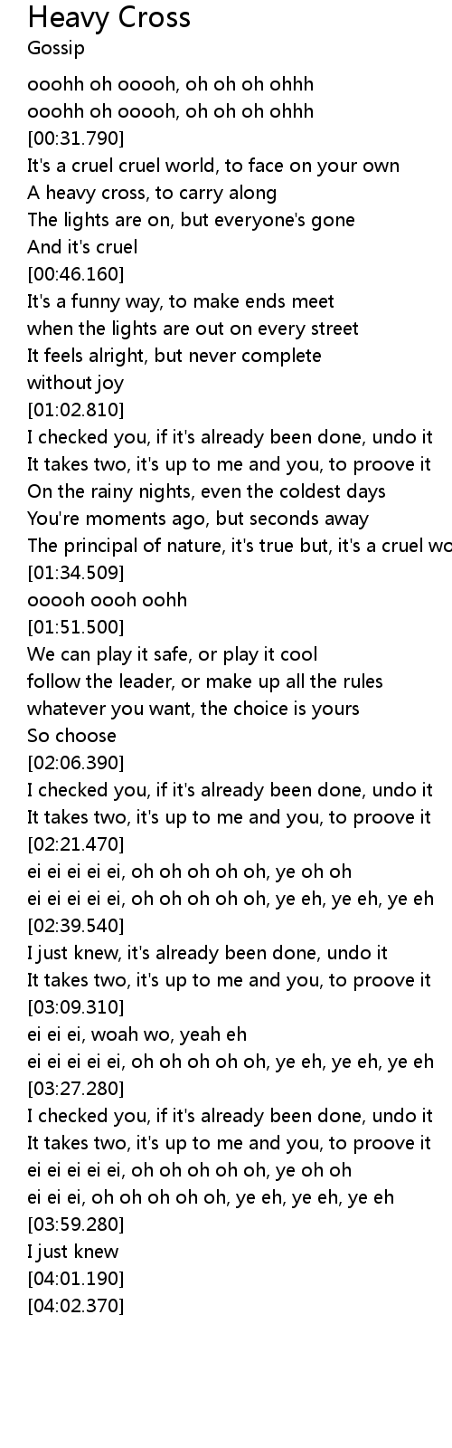 | [00:32.110] | It' s a cruel cruel world, to face on your own |
