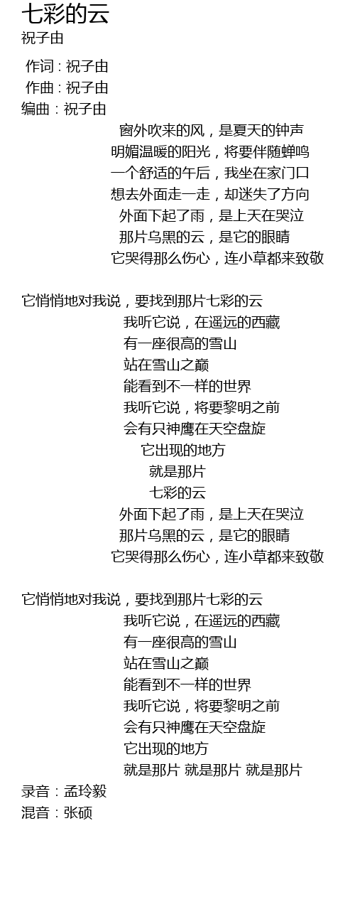 | [02:30.223] | 它悄悄地对我说,要找到那片七彩的云 |