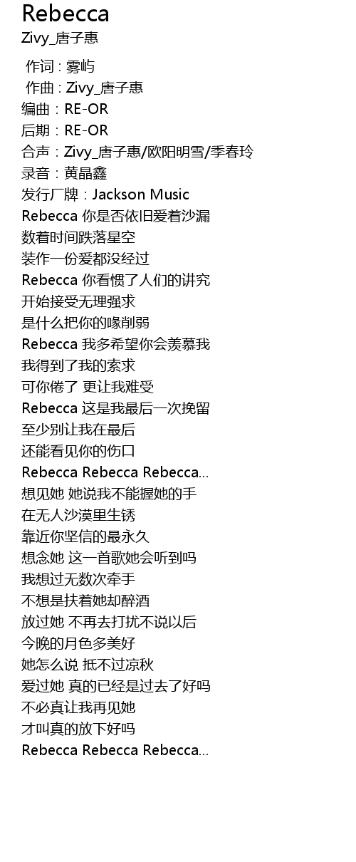 | [01:40.250] | Rebecca zhè shì wǒ zuì hòu yī cì wǎn liú |