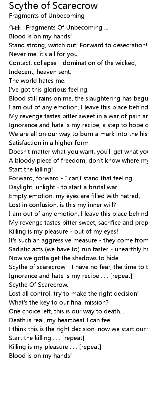 | Scythe of scarecrow I have no fear, the time to think this time is near. | |