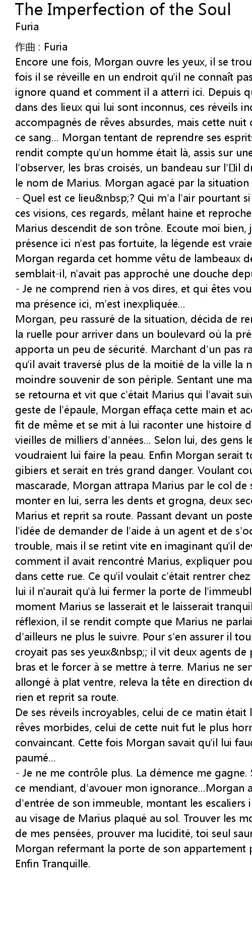 | Encore une fois, Morgan ouvre les yeux, il se trouve dans une ruelle, encore une fois il se ré veille en un endroit qu' il ne conna t pas. Cette fois encore, il ignore quand et comment il a atterri ici. Depuis quelques mois, il se retrouve dans des lieux qui lui sont inconnus, ces ré veils incohé rents sont toujours accompagné s de r ves absurdes, mais cette nuit c'é tait horrible, cette femme, ce sang... Morgan tentant de reprendre ses esprits regarda autour de lui et se rendit compte qu' un homme é tait là, assis sur une grosse poubelle, en train de l' observer, les bras croisé s, un bandeau sur l' il droit. Il se pré senta sous le nom de Marius. Morgan agacé par la situation s' interrogea nbsp: | |
