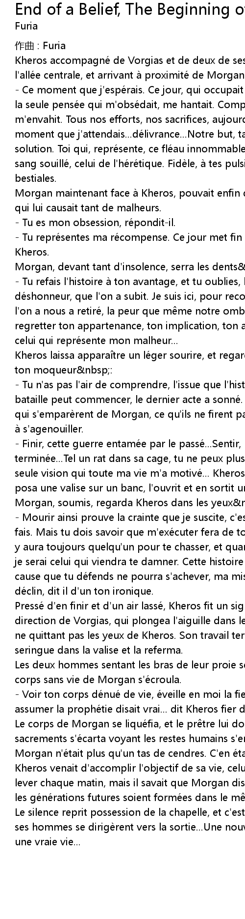 | Ce moment que j' espe rais. Ce jour, qui occupait tout mon esprit. Tu e tais, la seule pense e qui m' obse dait, me hantait. Comprend la, satisfaction qui m' envahit. Tous nos efforts, nos sacrifices, aujourd' hui enfin aboutissent. Ce moment que j' attendais... de livrance... Notre but, ta suppression, seule solution. Toi qui, repre sente, ce fle au innommable. Dans tes veines, coule un sang souille, celui de l' he re tique. Fide le, a tes pulsions visce rales et bestiales. | |