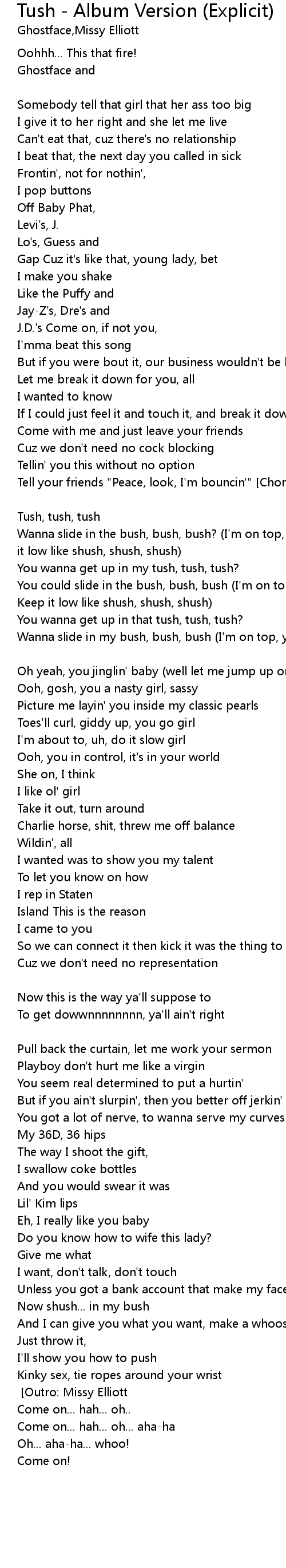 Wanna slide in my bush, bush, bush (I'm on top, you like push, push, push Keep it low like shush, shush, shush) [Ghostface Killah] |