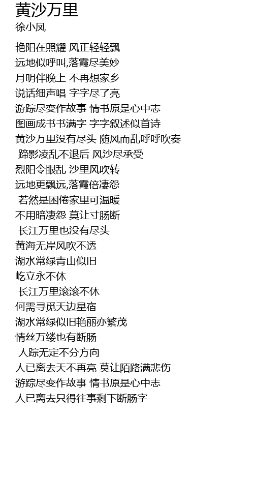 | [00:59.20] | huáng shā wàn lǐ méi yǒu jìn tóu suí fēng ér luàn hū hū chuī zòu |