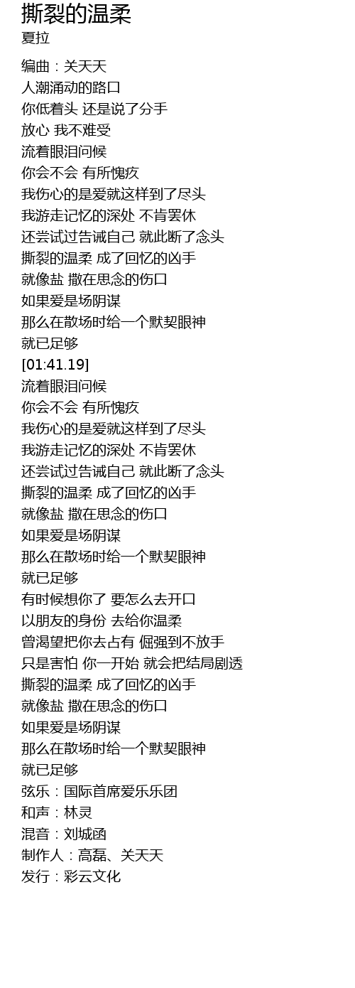 | [01:13.06] | 撕裂的温柔 成了回忆的凶手 |